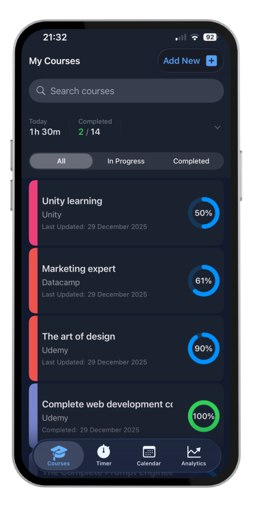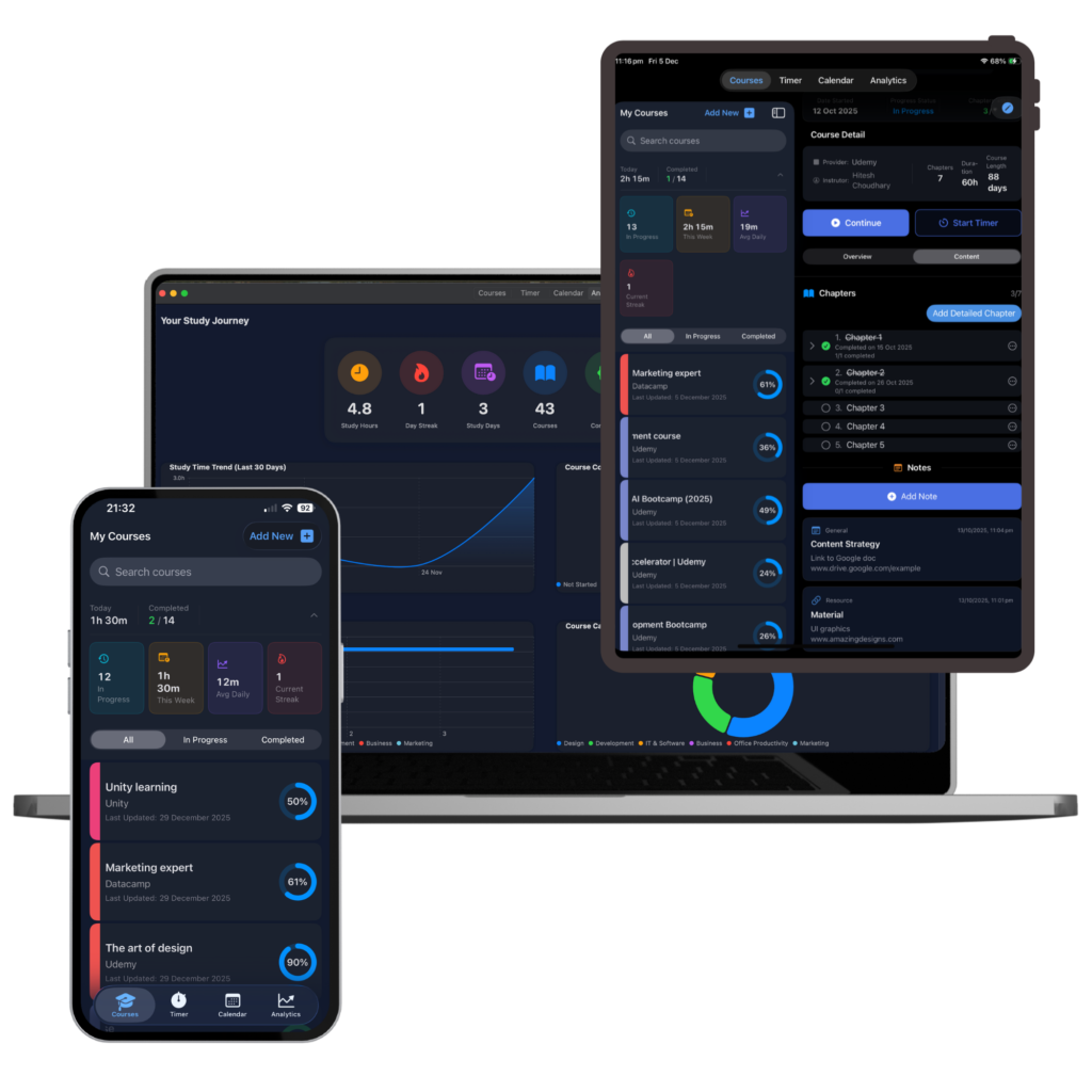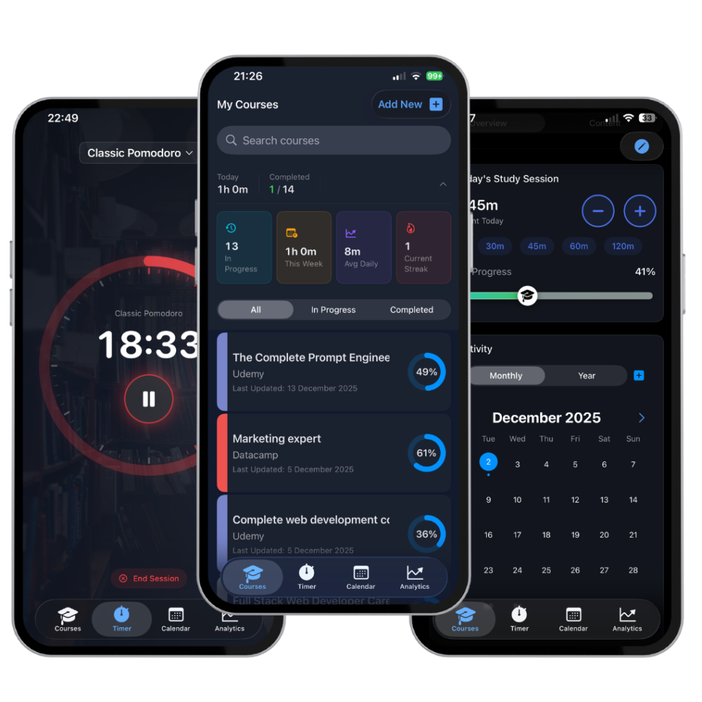 Organise online courses, stay focused with built-in timers, and see real progress across everything you’re learning.