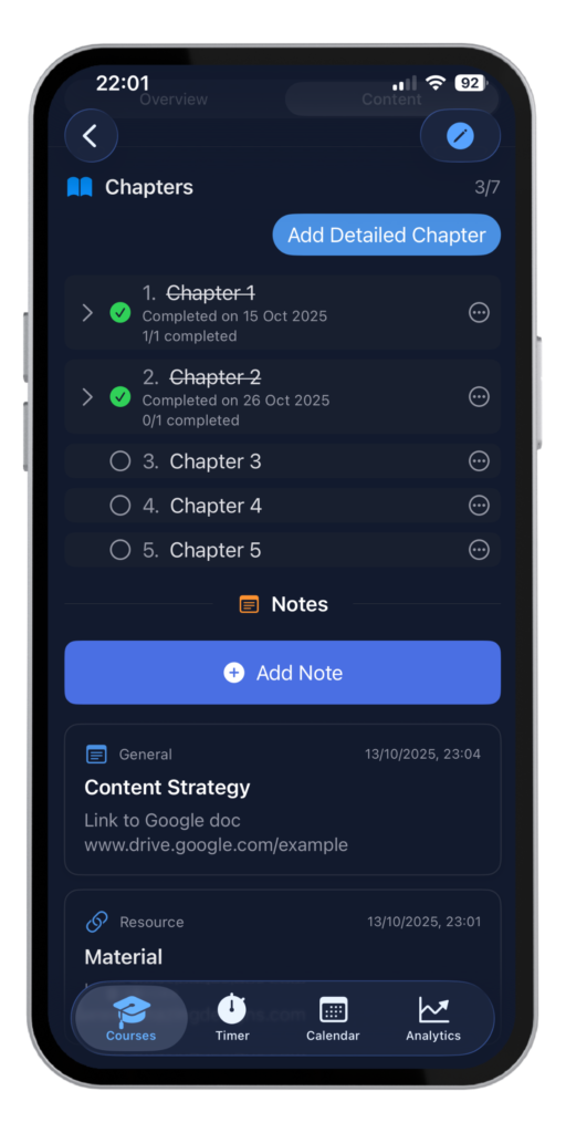 Organise chapters, attach links, and create rich notes directly inside each course — so everything you learn stays connected.