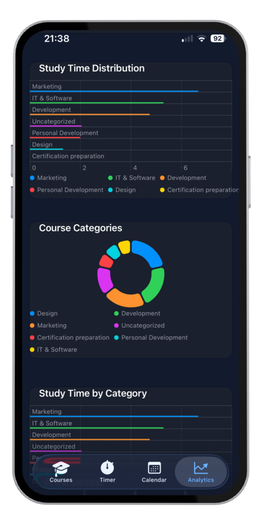 Track study time, completion rates, and learning habits with clear, visual analytics that keep you moving forward.